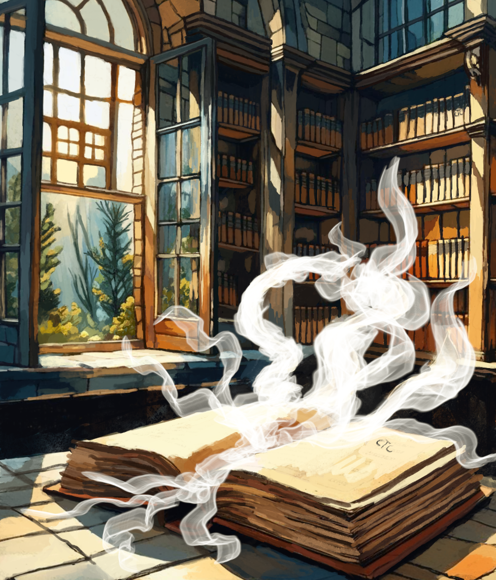 (I painted this on Procreate using the HB pencil brush, Eaglehawk Brush and Smoke Brush. I made reference sketches a few days before of the interior of Waterstones Bookshop to get an idea of the library’s interior. As you can tell, I painted the smoke last and had lost interest in the painting by that point. - Chaiga T. Cheska)